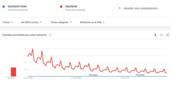 La réponse est non, en comparant les recherches « tourisme » et « tourisme hiver » sur Google Trend, on se rend compte que les deux mots clés tourisme et hiver ne sont quasiment jamais utilisés ensemble par les internautes.